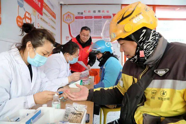 2025年3月5日,志愿者在山东省枣庄市市中区一工会驿站为外卖员免费测量血糖皇冠信用网开户 。新华社发(王海楠摄)